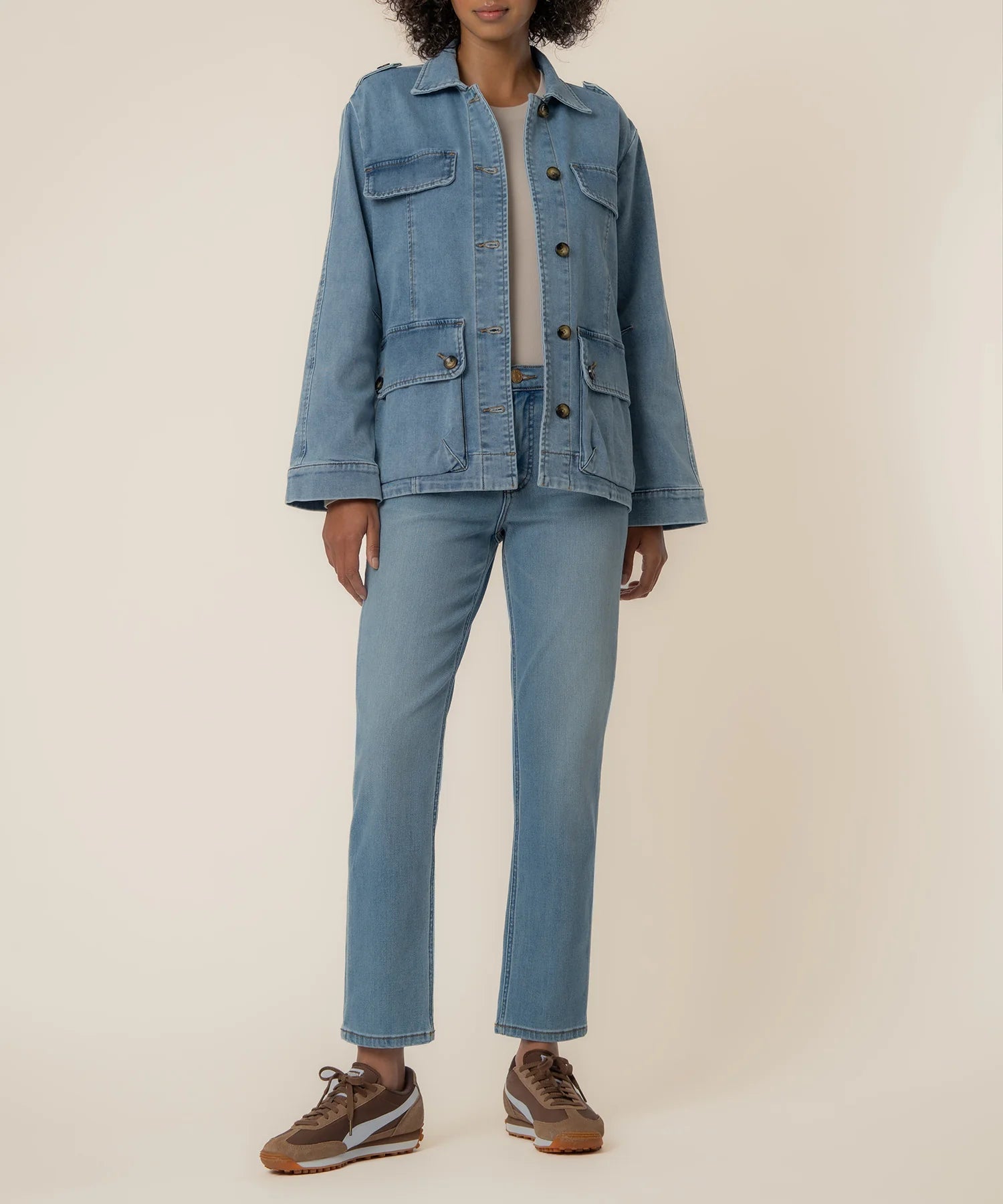 • Stay effortlessly stylish in this oversized denim jacket featuring a classic medium wash, pockets with flap, and bold button detailing. Perfect for layering, this timeless piece adds a laid-back edge to any outfit.