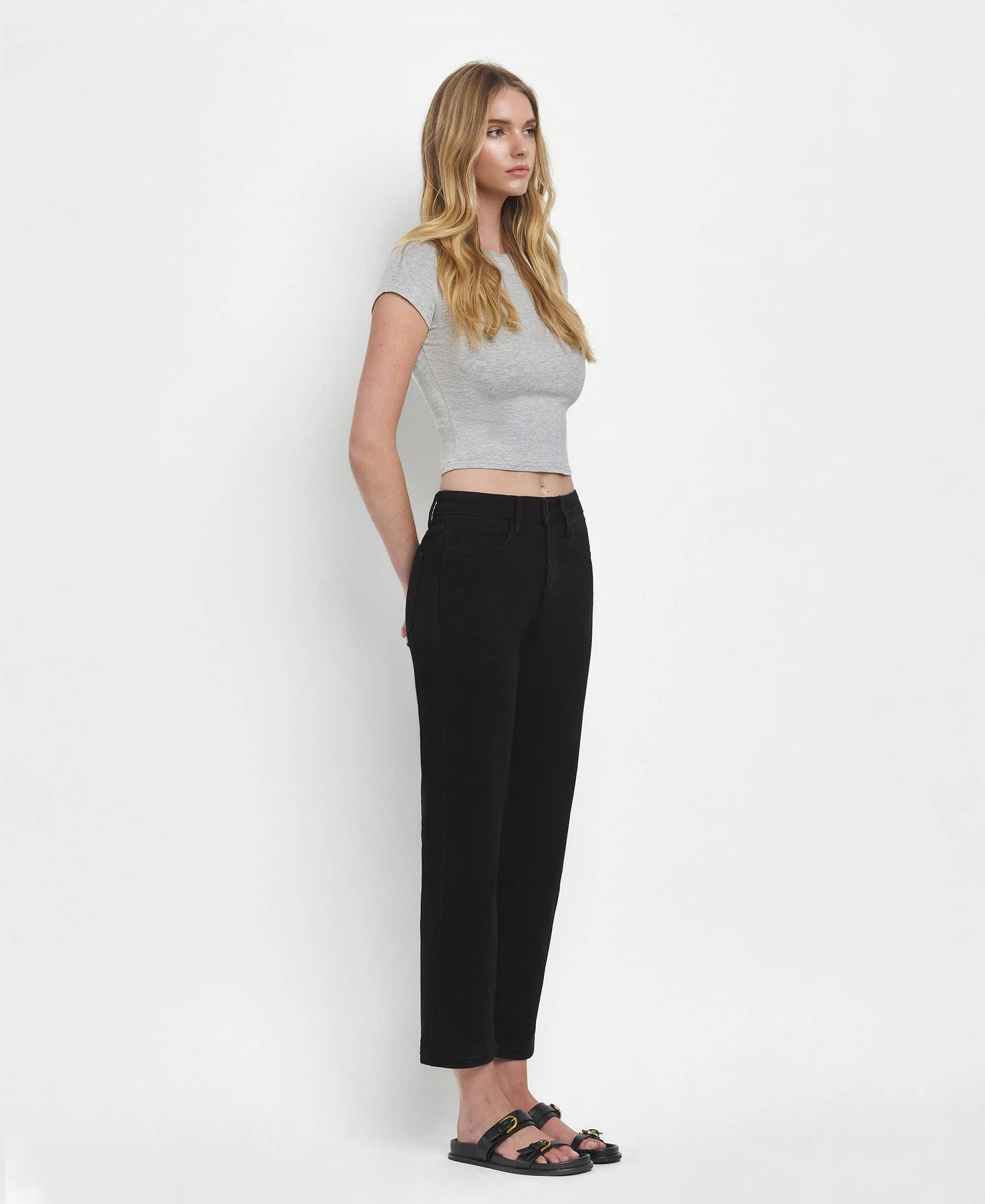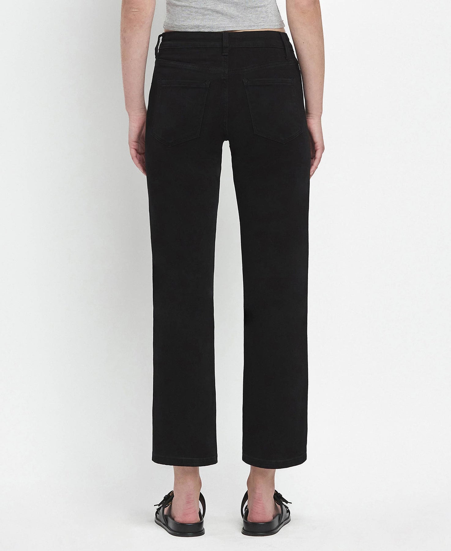 HIGH RISE ANKLE STRAIGHT JEANS COMFORT STRETCH DENIM, HIGH RISE WAIST, FINISHED HEM, ANKLE LENGTH, STRAIGHT JEANS F. RISE: 10 1/4" / INSEAM: 28" / LEG OPENING: 16 1/2" MODEL IS 5'10" WEARING A SIZE 26