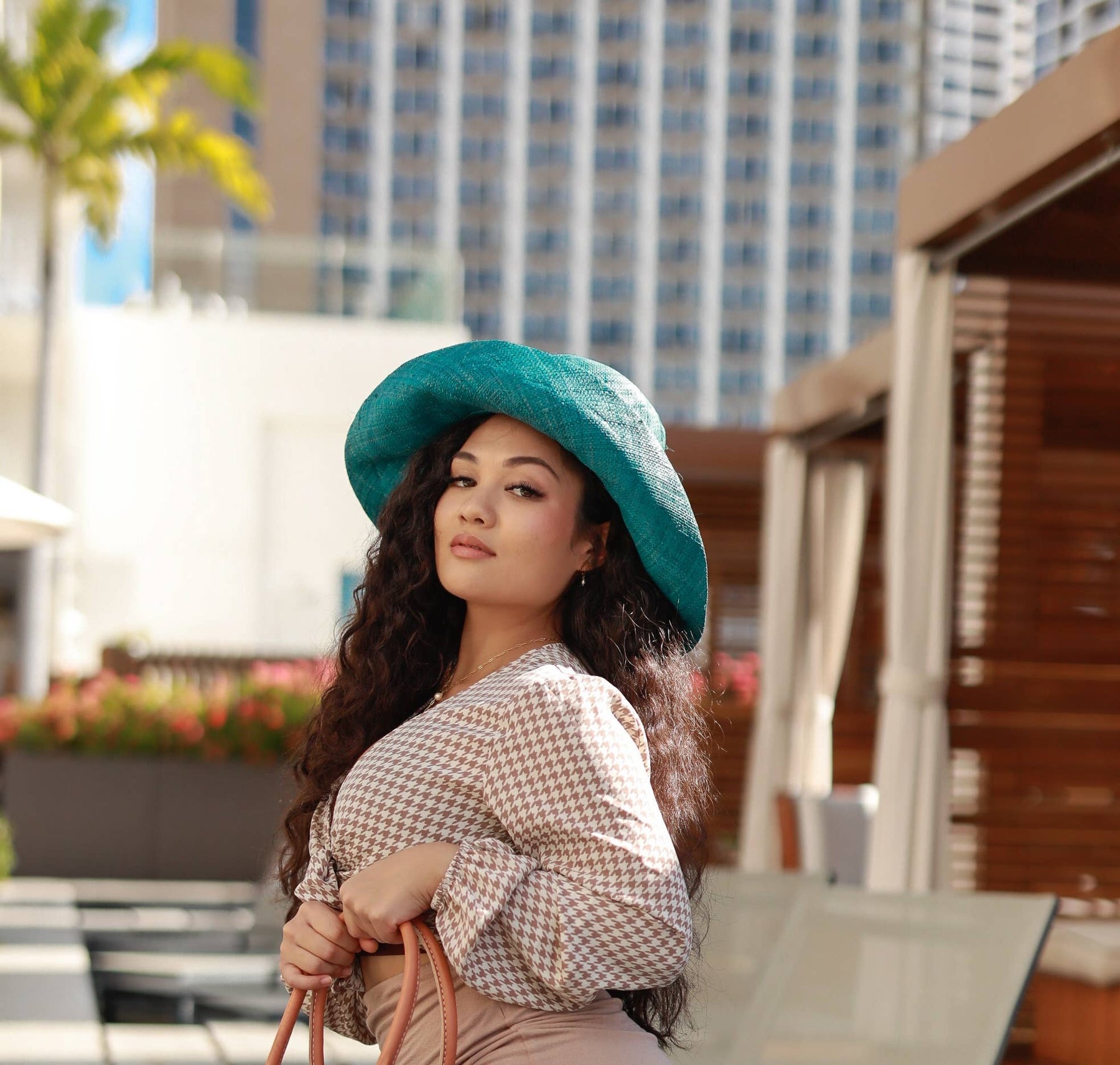 Beautifully saturated hues of hand dyed natural raffia palm fibers, hand loomed into a supple textile create these solid toned hats.