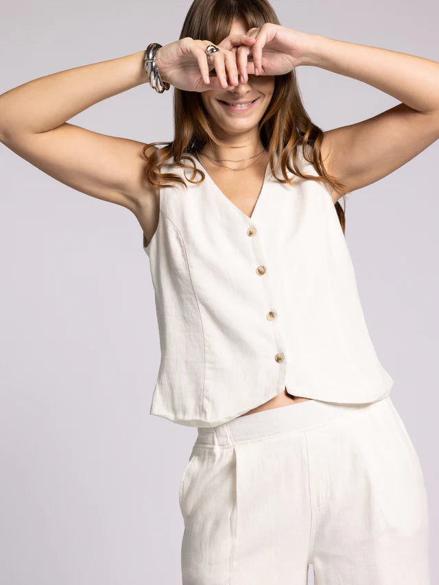 Elevating a classic look with a twist, this vest boasts a staple design with a button-front, V-neckline, and tailored darting at the hem. Made from a breezy linen blend, it pairs perfectly with the Anastasia Pant for a complete look. Complete with a full button front and detailed measurements for a size small: Length: 21", Chest: 14.5", Sweep: 14.5". Fabric Content/Care: 55% Linen, 45% Rayon. Machine Wash Cold.