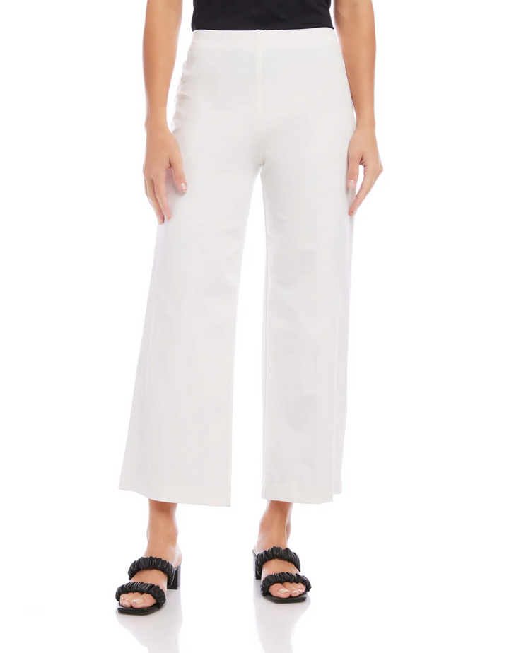 Elevate your style with these wide-leg cropped pants designed to flatter every figure. Crafted from a luxurious blend of viscose, cotton, and spandex, they offer both elegance and exceptional comfort. Featuring a pull-on elastic waistband and a flattering front rise, these pants provide ease and a perfect fit. Made in the USA from imported fabric, they are easy to care for with dry clean or machine wash options. The generous leg opening and tailored inseam create a chic, modern silhouette ideal for any occasion.